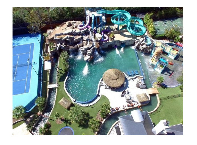 Decked out with a full-fledged waterpark, an in-ground trampoline and a resort-like décor, this mansion is clearly moonlighting as a theme park. Needless to say, whoever furnished this tricked out party space knows how to have a good time.