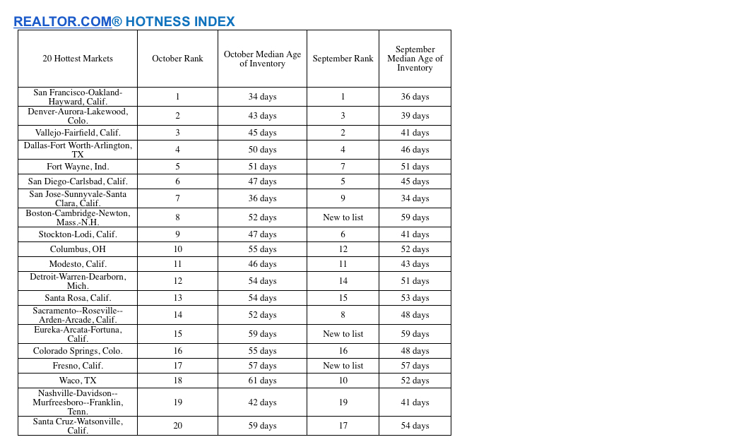 The hottest markets in October, as ranked by realtor.com, are seeing inventory move 18 to 45 days faster than other markets.