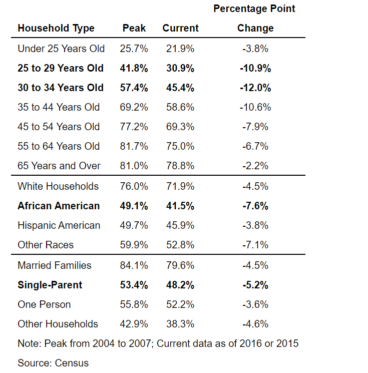 The lowest homeownership rates are among African-American, single person and young adult households, according to the report. The African-American homeownership rate shrunk to 41.5 percent in 2016, down from its peak by 7.6 percentage points; the single person homeownership rate was 48.2 percent in 2015, 31 percentage points below that of married households; and the young adult homeownership rate was 30.9 percent in 2016, down 10.9 percentage points.