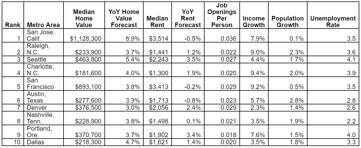 “This list shows that just because a market is smaller or more affordable doesn’t mean it isn’t dynamic,” says Aaron Terrazas, senior economist at Zillow. “Growing cities in the Sun Belt, places like Raleigh, Charlotte and Nashville, offer plenty of opportunities in healthcare and finance, while providing a less-expensive, but still-convenient alternative to the larger and pricier markets in the Northeast. The tech industry continues to roar, attracting thousands of new residents per year to tech-dominant markets like Seattle, Denver and the Bay Area. The higher cost of living in these areas is offset to a large degree by well-paying tech jobs.”