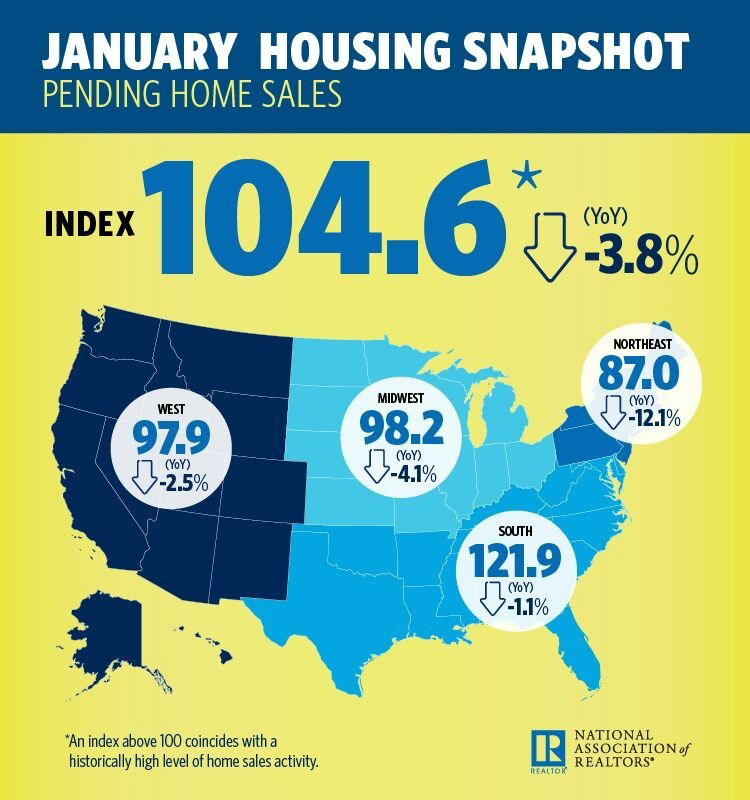“Even though contract signings were down, REALTORS® indicated that buyer traffic in most areas was up January compared to a year ago,” Yun says. “The exception was likely in the Northeast, where the frigid cold snap the first two weeks of the month may have contributed some to the region’s large decline.”