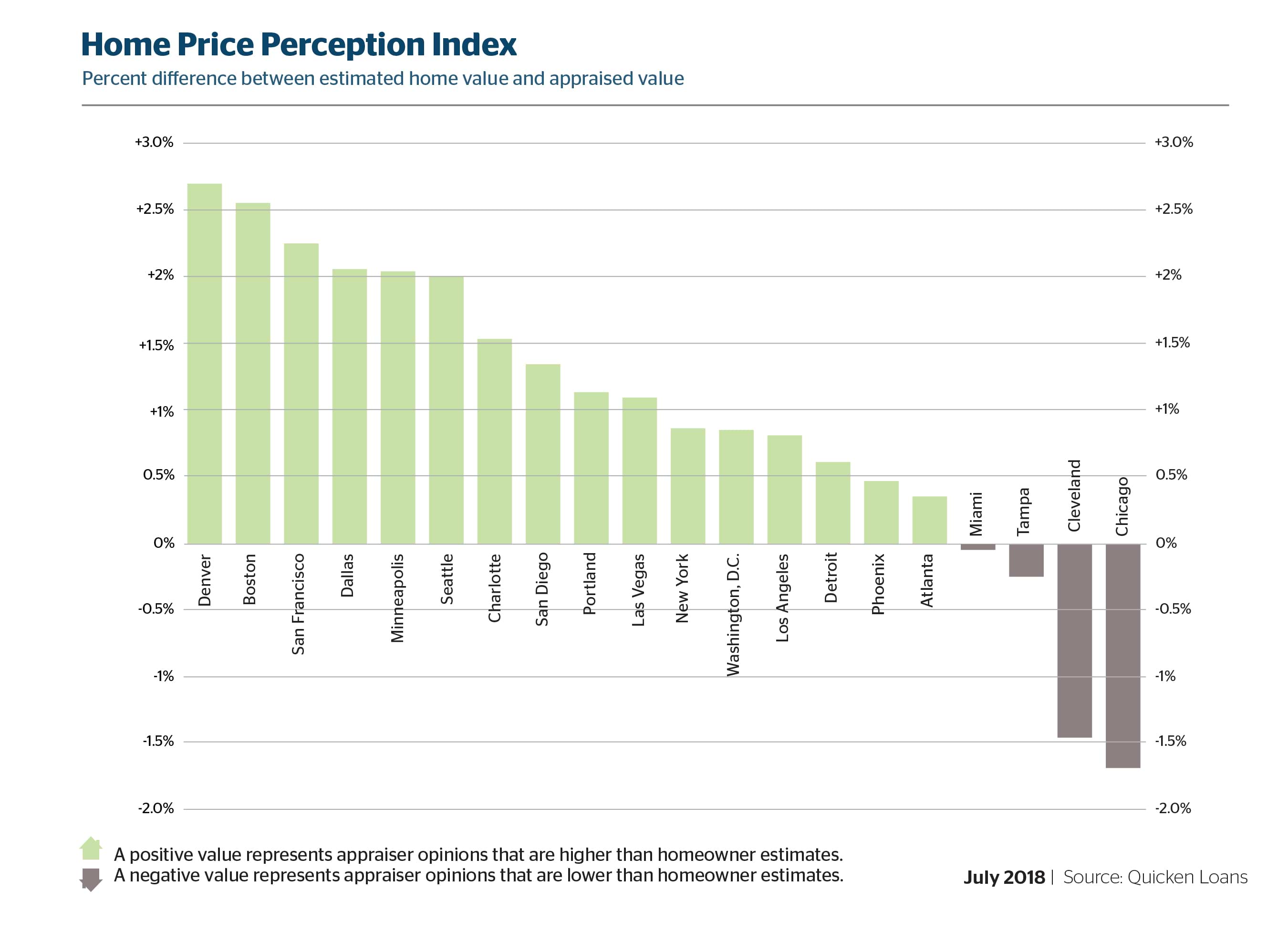 “Getting an accurate market value is an important, albeit often misunderstood, part of the mortgage process,” says Bill Banfield, executive vice president of Capital Markets at Quicken Loans. “The valuation has historically involved an appraiser coming to personally inspect the home and give their personal opinion of its value. Now more technology is becoming available to modernize the appraisal process; however, even with a more data-based approach, there can be some disconnect between the appraised value and homeowners perception of value. We hope the Home Price Perception Index can shine some light on that gap, limiting surprises during a home sale or mortgage refinance.