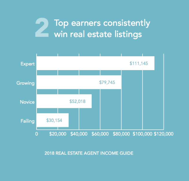 Top earners in real estate know how to win a listing. Those who identified themselves as experts in this category reported an average annual income of $111,145 while those who said they felt like they were failing at winning listings had an annual income of $30,154.