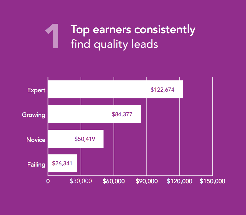Agents who said they were experts at finding quality leads earned almost $100,000 more than those who said they were failing. More importantly, there was about a $34,000 difference in earnings between agents who were novice and those who were growing in this area. This could be a significant place for improvement for early career agents who want to take their business to the next level.