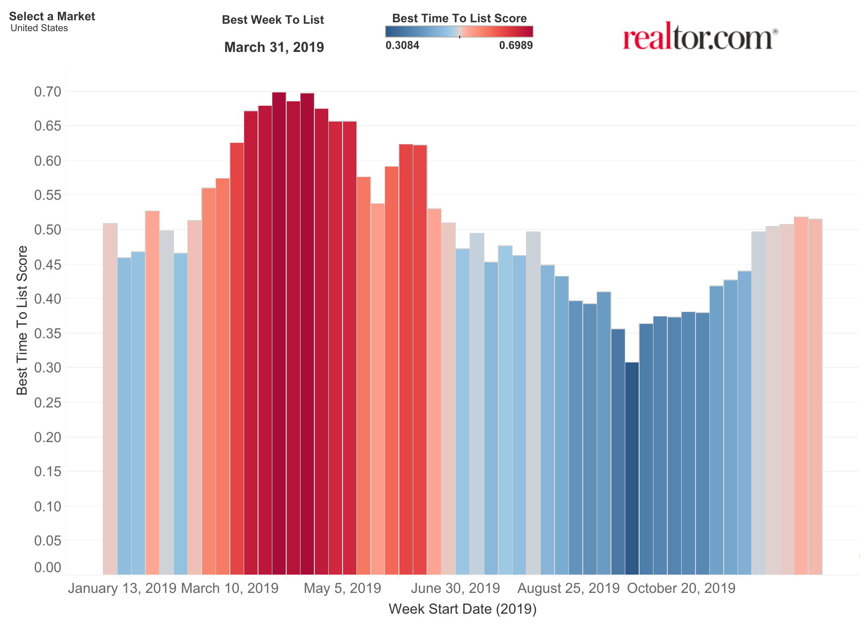 Based on several factors—including trends in median listing prices, property views on realtor.com, home price drops, median days on market and the number of listings on the market in the last three years—realtor.com determined that the best time to sell, on average, is the first week of April. Why? Competition is still low, but buyers are out in droves, snapping up homes and driving up home values.