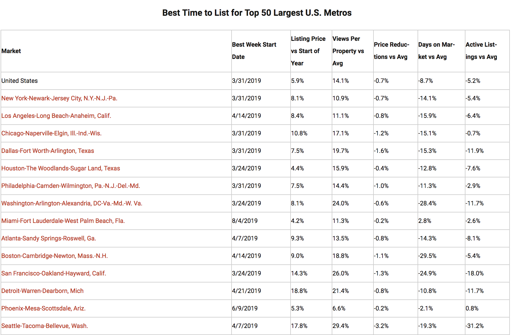Here’s the best time to list for the top 50 largest U.S. metros, according to the report: