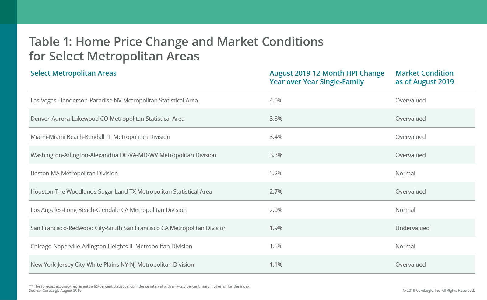“The 3.6 percent increase in annual home price growth this August marked a big slowdown from a year earlier when the U.S. index was up 5.5 percent,” says Dr. Frank Nothaft, chief economist at CoreLogic. “While the slowdown in appreciation occurred across the country at all price points, it was most pronounced at the lower end of the market. Prices for the lowest-priced homes increased by 5.5 percent, compared with August 2018, when prices increased by 8.4 percent. This moderation in home-price growth should be welcome news to entry-level buyers.”