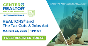 NAR PULSE—Tell your agents to join NAR’s Center for REALTOR® Financial Wellness’ REALTORS® and The Tax Cuts and Jobs Act webinar, March 23, 1 p.m. CT, to learn how newly enacted tax provisions can be used by REALTORS® to increase both their net after-tax business income and investment income. Click here to learn more and register. Missed past webinars? View recordings at NAR.realtor/CFFW/webinars.