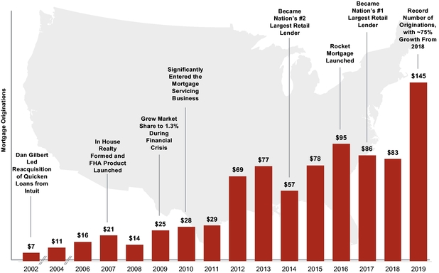Below is a timeline of Quicken Loans’ mortgage origination business ventures: