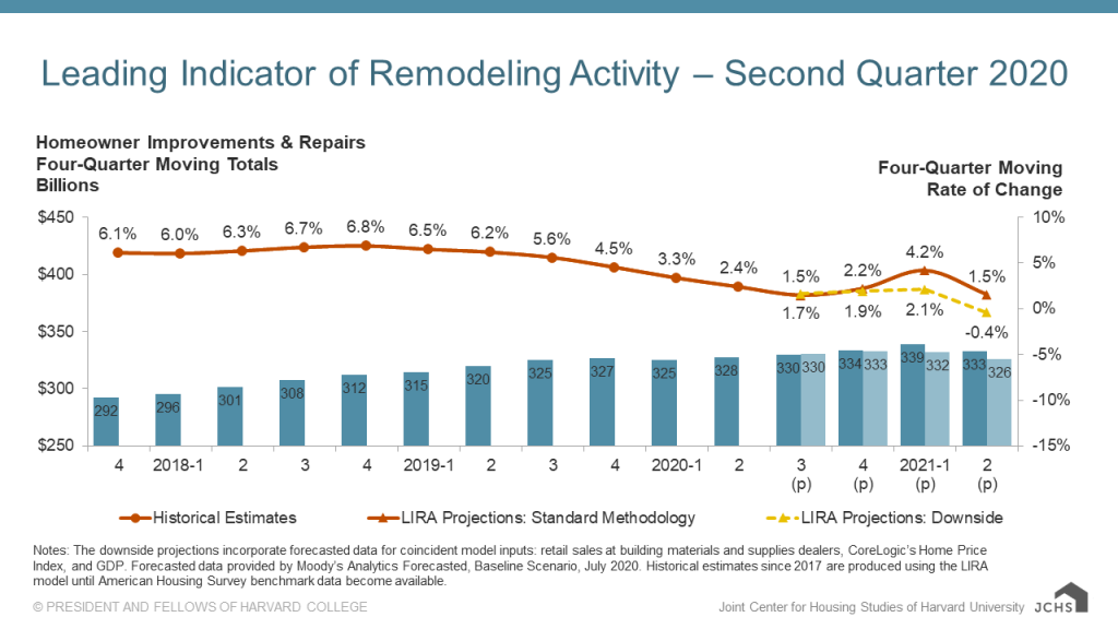Expenditures for improvements and repairs to owner-occupied homes are expected to slow by the middle of next year as the COVID-19 pandemic continues to unfold, according to the Leading Indicator of Remodeling Activity (LIRA) released by the Remodeling Futures Program at the Joint Center for Housing Studies of Harvard University.