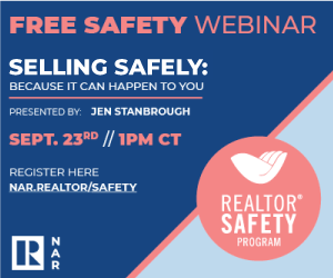 NAR PULSE—Safety Month is here, and registration is officially open for a free REALTOR® Safety webinar on Sept. 23, 1 p.m. CT. Encourage your agents to register to hear Jen Stanbrough discuss how to be aware, prepared and safe on the job.