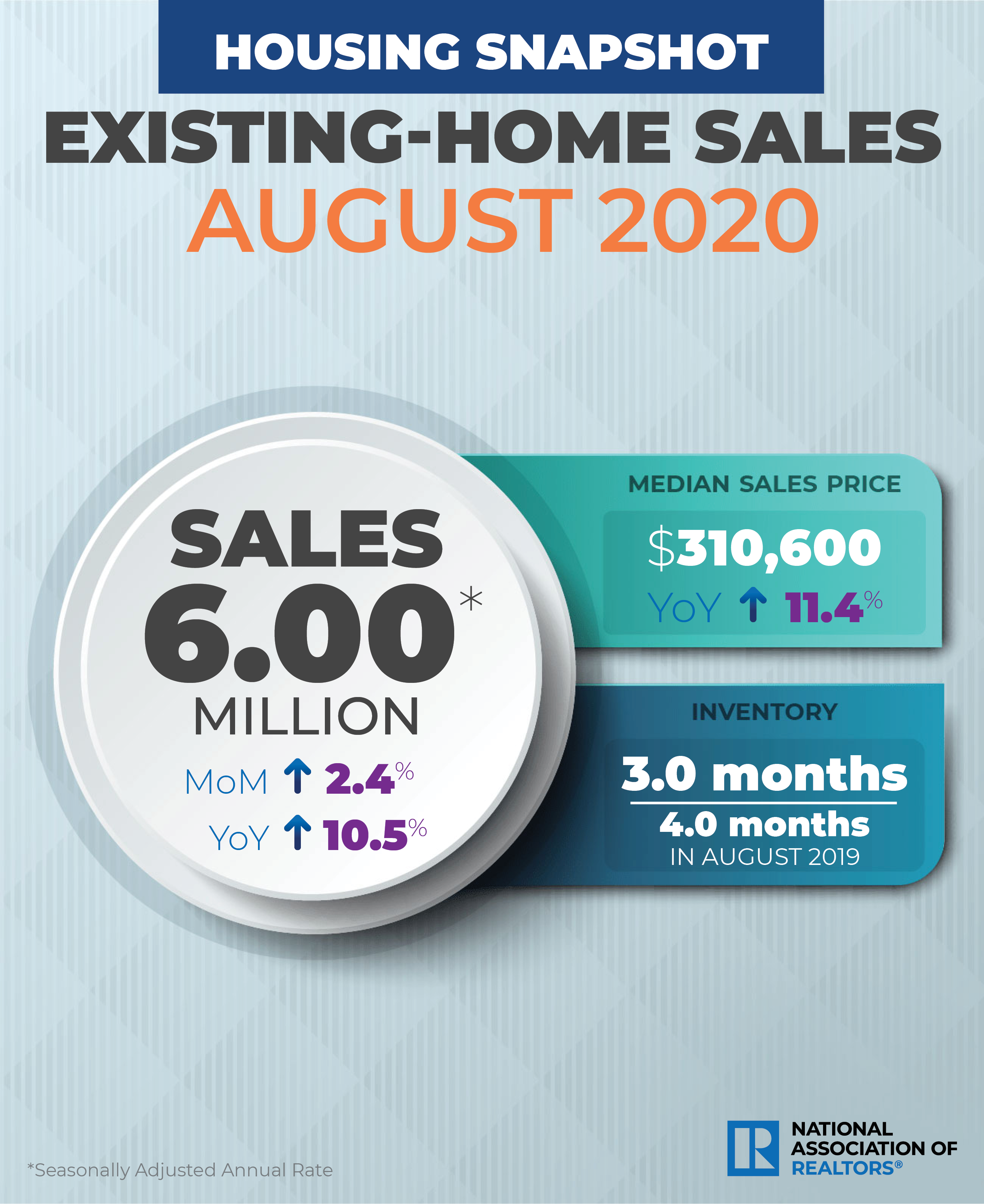 “The August increase in existing-home sales was further confirmation of the housing market’s V-shaped recovery and overall strength in demand. The annualized pace of sales hit the 6-million mark for the first time since 2006, as transactions delayed by the pandemic continued to catch up. August was the second consecutive month of strong year-over-year sales gains, which is noteworthy considering the declines from April through June, and sales being down 31 percent in May. Last month’s strong sales activity was consistent with MBA’s purchase applications data, which has risen annually for four straight months.