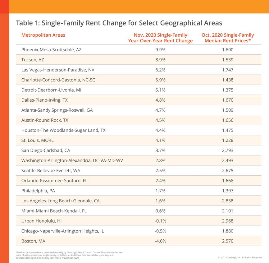“Rent increases for single-family properties rebounded in recent months and in November exceeded the pre-pandemic rate,” said Molly Boesel, principal economist at CoreLogic. “This is in contrast to rents for multifamily properties, which have decreased as tenant preferences shifted away from high-density apartment buildings to low-density, single-family homes.”