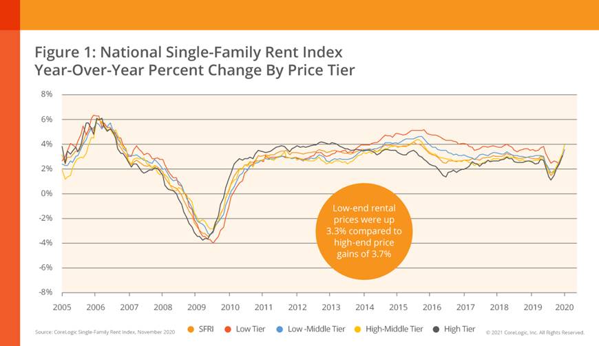 To gain an accurate view of single-family rental prices, CoreLogic examines four tiers of rental prices. In November 2020, three price tiers surpassed their pre-pandemic levels. The national single-family rent growth across the four tiers, and the year-over-year changes, were as follows: