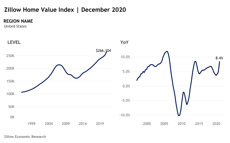 “The housing market ended 2020 with an exclamation point, as home values rose sharply near the end of the year at their fastest quarterly rate on record,” said Jeff Tucker, senior economist at Zillow. “Sales are taking place at a rapid clip as momentum gathering in the market since June is still pushing forward at full force and is expected to continue for the foreseeable future. Although prices are skyrocketing, record-low mortgage rates keep bringing buyers to the table by keeping monthly payments in reach.”