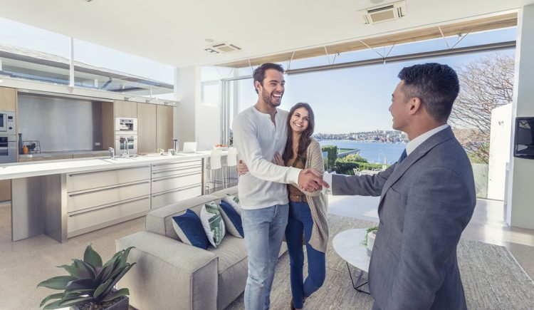 Real estate agent with couple in luxury home. They are shaking hands. There is a water view, kitchen and living room in the background. Couple are casually dressed. They are laughing. Agent is dressed in a suit and smiling. Wide angle.