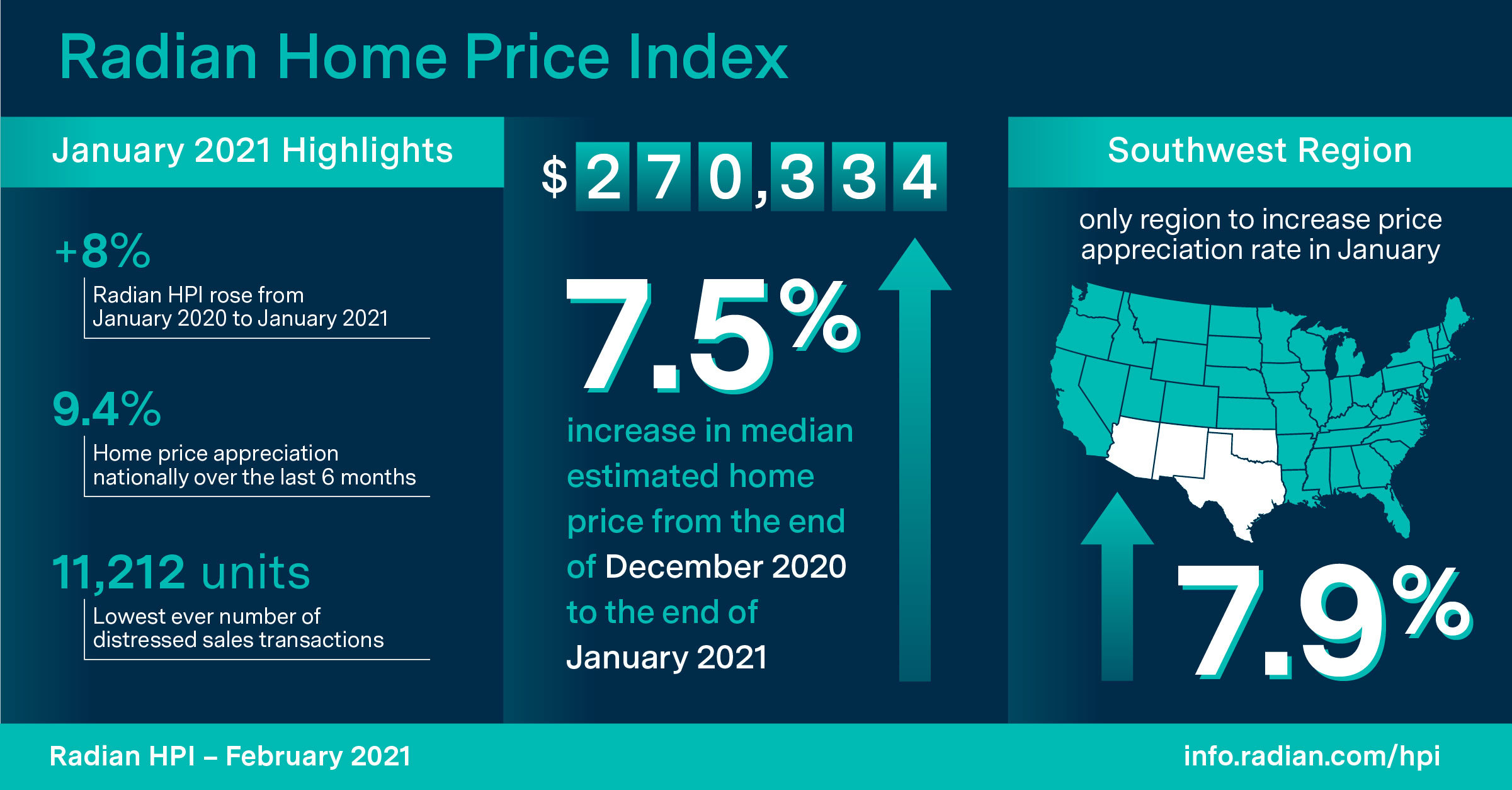 For the past 12 months, the Radian HPI rose 8.0% (January 2020 to January 2021), unchanged from the prior month’s annualized rate. Over the last six months of the year, home prices nationally appreciated at an annualized rate of 9.4%. This represents the fastest rate of six-month appreciation in more than a year. The Radian HPI is calculated based on the estimated values of more than 70 million unique addresses each month, covering all single-family property types and geographies.