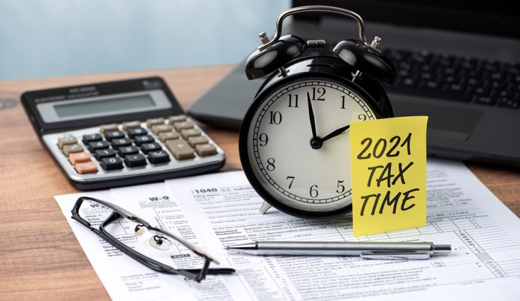 2021 TAX TIME note is on the alarm clock. Tax and business concepts