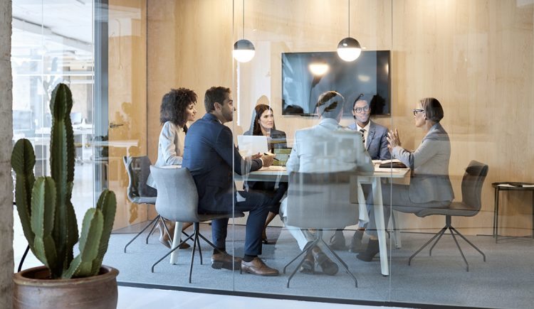 Senior businesswoman explaining strategy with colleagues in board room. Multi-ethnic professionals are discussing while sitting at desk in office. They are seen through glass.