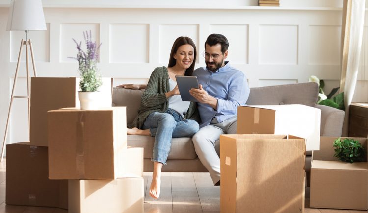 Full length happy family sitting on couch among cardboard boxes in new house, using digital tablet, buying decorations online. Smiling couple enjoying moving in new apartment, shopping in internet.