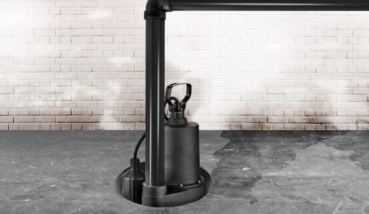 A sump pump sits in a small pit on the basement floor. It turns on automatically if it detects a rise in the water table and pumps water away from the house to prevent flooding in the basement.