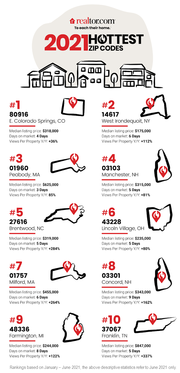 “By definition, the ZIPs that make our annual hottest report are very competitive, but this year, they are white hot. Homes in this year’s ZIPs are under contract in less than a week, which is three times faster than the contract times for last year’s hottest markets,” said realtor.com® Chief Economist Danielle Hale. “While there’s no question that buyers have faced a challenging housing market during the pandemic, our Hottest ZIPs list also highlights some of the silver linings. The rise in remote work has given some buyers more flexibility to live wherever they want, and many are finding larger homes at lower prices, as well as a higher quality of life, in the 2021 Hottest ZIPs.”