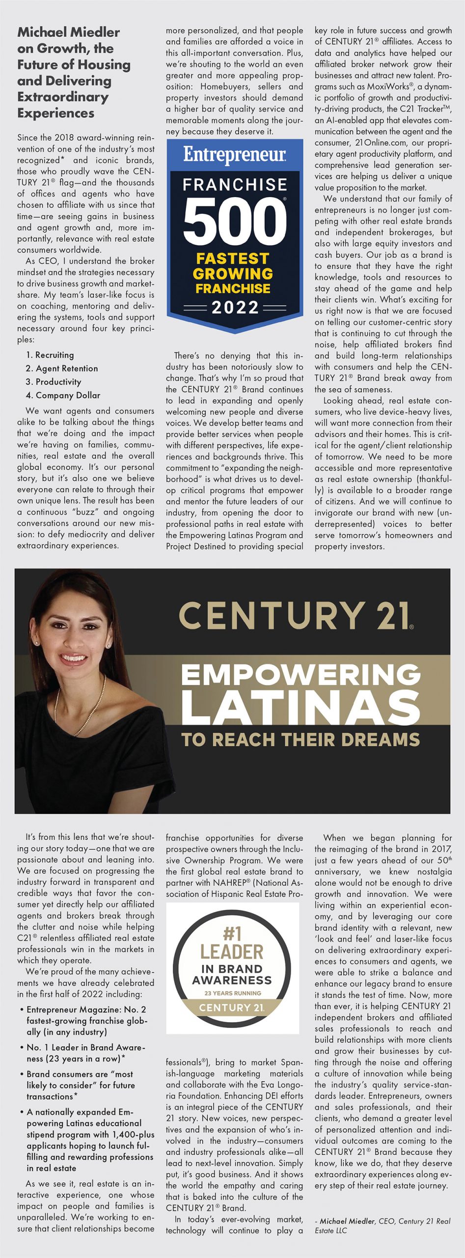The CENTURY 21® Brand is challenging existing conventions in real estate relationships and progressing the industry in ways that favor the consumer yet directly help its affiliated brokers and agents break through the clutter and noise, win in the markets they operate in and ultimately, drive growth for their business. By reinventing itself and transforming its network with a clean and clear stage for individual personalities and unique stories to be told, the 51-year-old legacy global franchisor has built an organization that continues to grow and be known by many consumers and industry professionals alike as “the gold standard in real estate.”