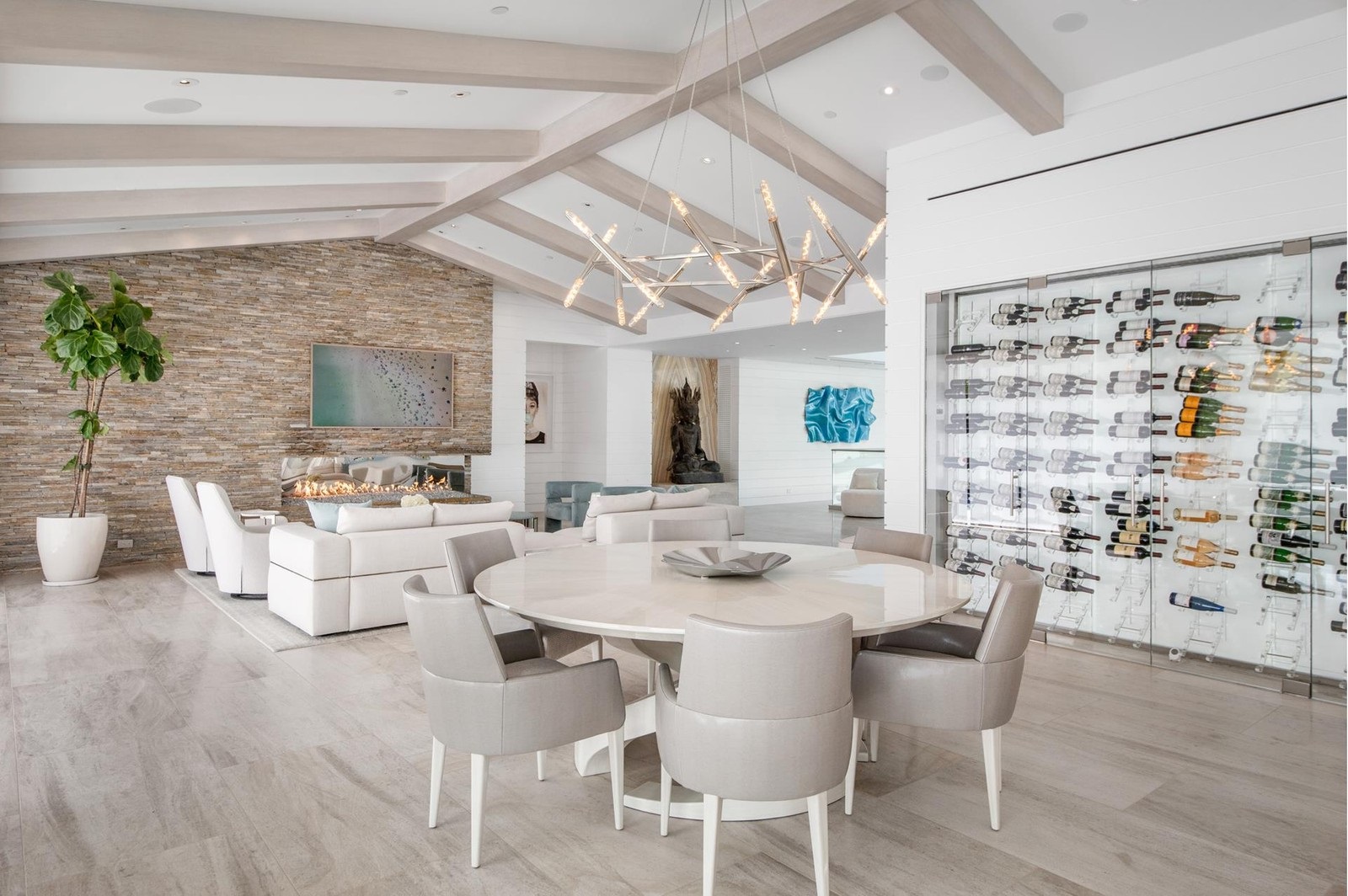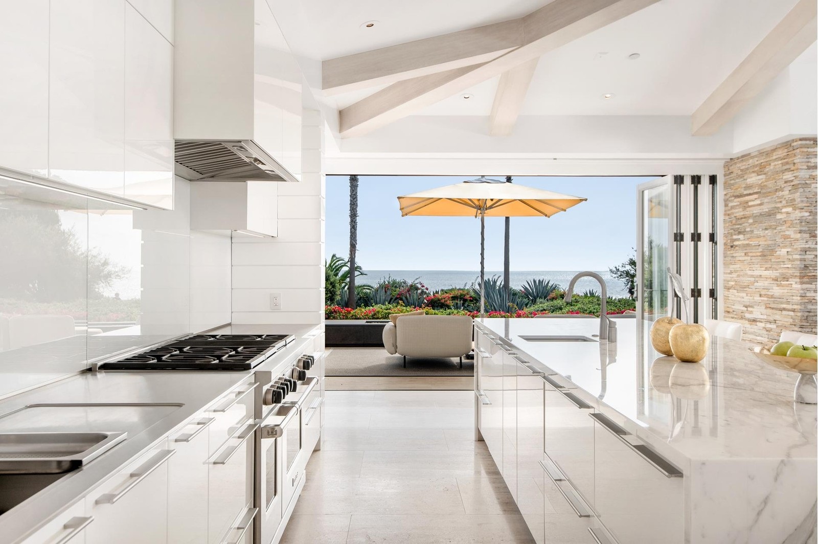 The upper level features a spacious living area with a modern glass fireplace, vaulted ceilings, temperature-controlled wine wall, and a chef’s dream Bulthaup kitchen with stainless steel Miele appliances, Wolf range and a stainless steel pantry with a Dacor wine station. The kitchen flows seamlessly to the home’s outdoor oceanside oasis, complete with a brand new glass fire pit, outdoor shower, outdoor kitchen with built-in Viking grill, ice maker, refrigerator, Kalamazoo pizza oven, and sparkling pool and spa accessible directly from the master suite.