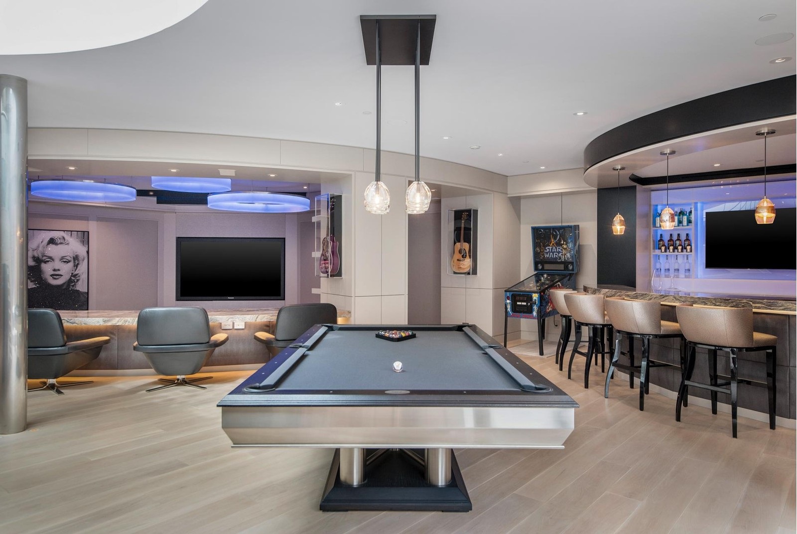The extravagant lower level is accessed via a dramatic floating staircase and leads to a full bar, home theater, gaming space, incredibly spacious and luxurious home office center complete with a full bath, glass-encased commercial wine cellar and an outdoor courtyard with a one-story waterfall.