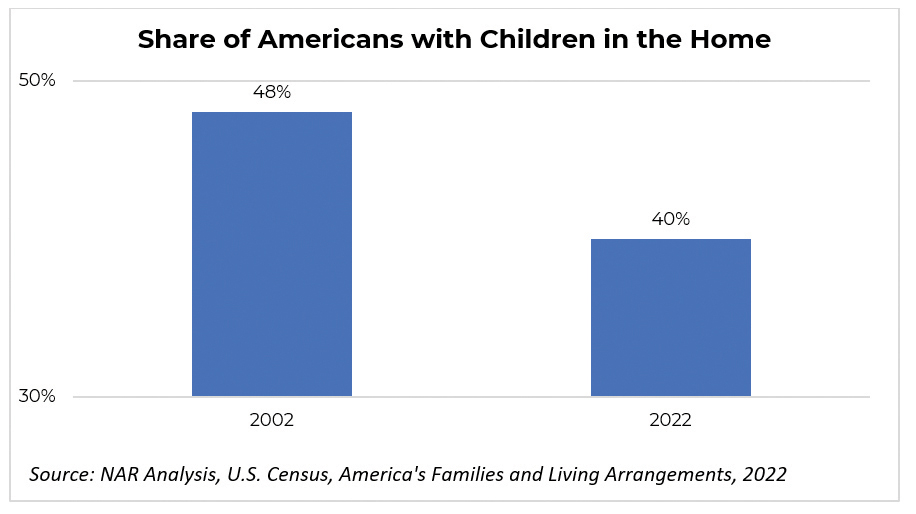 Did you know there are currently more households with pets than children? According to the U.S. Census, the share of families with children under the age of 18 living in the home has continued to decline. The share with children in 2022 stands at 40%, down from 48% in 2002. This is likely for two reasons: birth rates overall have been declining (outside of the increase in the last year), and there is a large share of baby boomer households whose children have left the nest.