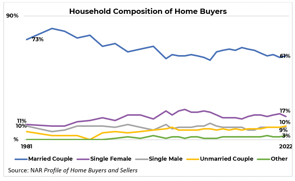 Married couples account for the largest share of homebuyers at 61%, while unmarried couples account for 10% of the market. Notably, unmarried couples are a sizable share of the first-time buyer market at 18%, up from just 4% in 1985. Overall, the typical age of a married couple purchasing is 53, while that of an unmarried couple is 47.