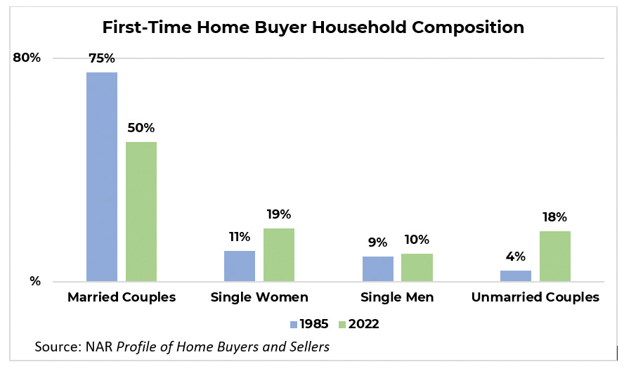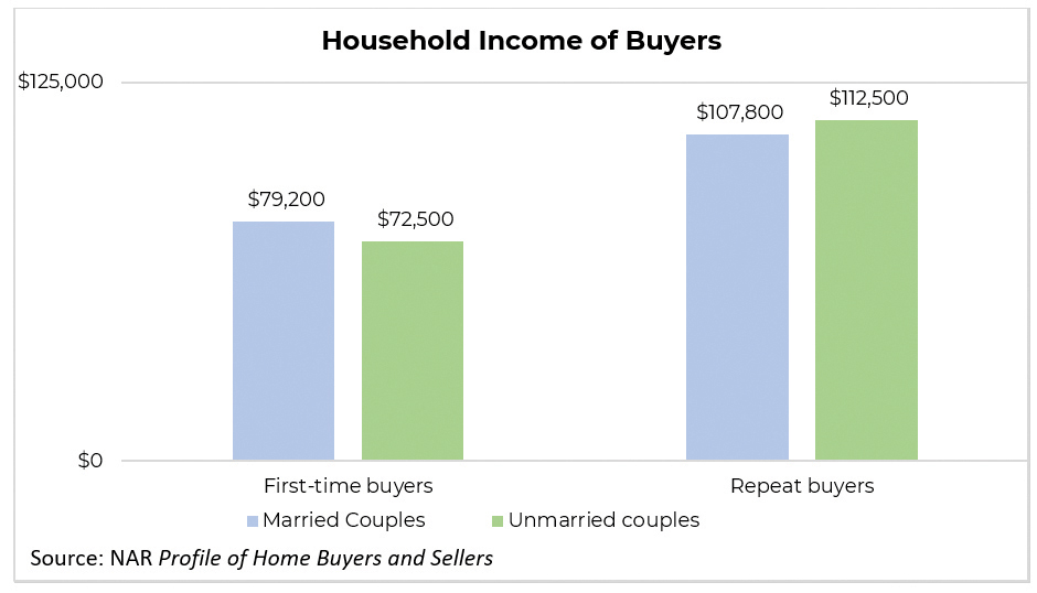 Married and unmarried couples have a significant leg up in a housing market stifled by a rise in both mortgage interest rates and home prices. Married couples who purchased a home as first-time buyers in the last year typically have a household income of $79,200, while unmarried couples usually have a household income of $72,500. These median incomes give both groups considerably more buying power than single homebuyers.