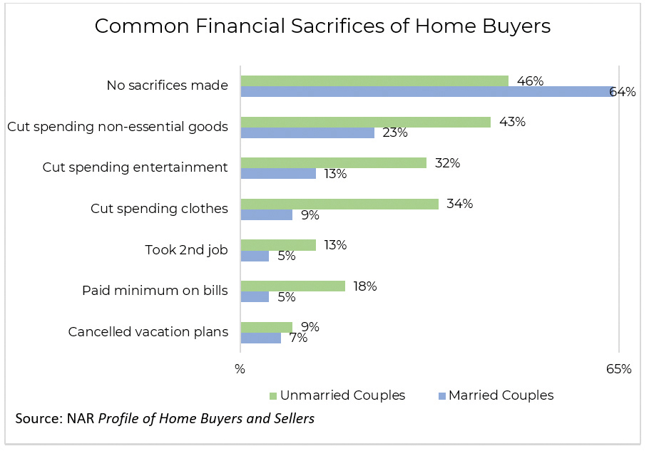 Perhaps due to age differences and the proliferation of unmarried first-time buyers, unmarried couples are significantly more likely to make financial sacrifices to enter homeownership than married couples. In examining the sacrifices made by unmarried couples, this group more closely mirrors single homebuyers than married couples. Single buyers (46%) and unmarried couples (43%), for example, are both more likely than married couples to cut spending on non-essential goods. Married couples are far more likely not to make any financial sacrifices at 64%.