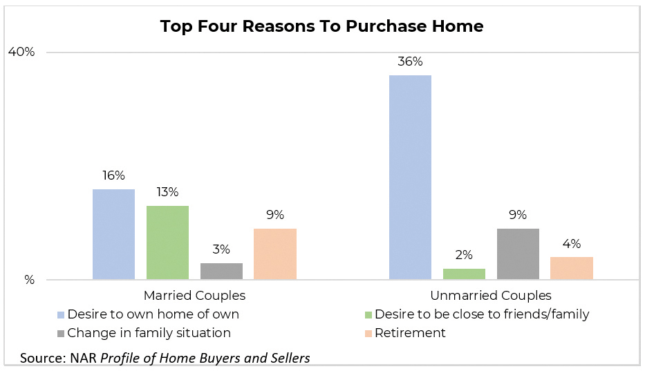 The reasons cited for purchasing a home show the different motivations of married and unmarried couples when it comes to the home purchase. Both are most likely to purchase because they want to own a home of their own. However, the share is quite different: 36% for unmarried couples compared to 16% for married couples. Additionally, the desire to be close to one’s family and retirement are more common reasons for a married couple’s purchase, whereas a change in a family situation is more common for unmarried couples.