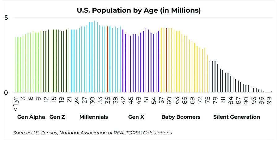 Looking at the U.S. population by age group (see chart to right), one can see that millennials are the largest generation of Americans ever. The red line represents the age of 36, which is the median age of today’s first-time homebuyers. This is the oldest seen since the National Association of REALTORS® (NAR) started collecting data on the age of buyers in 1981. Traditionally, the data has shown that the typical first-time buyer was between the ages of 28 and 33. (The second red line, at age 59, marks the median age of repeat buyers.)
