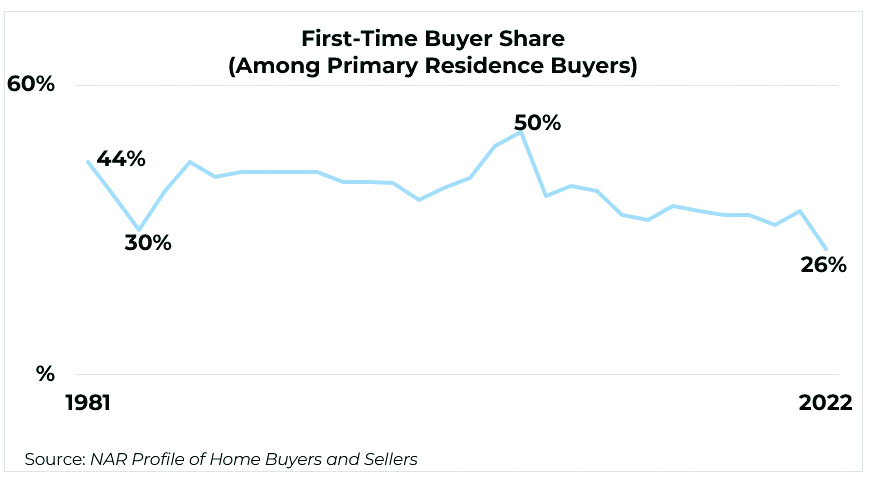 At the same time that the median age of first-time buyers has jumped, their share of the market is at historic lows. In 2023, first-time buyers made up just 26% of the primary residence market, while the historical average is 40%, dating back to 1981.