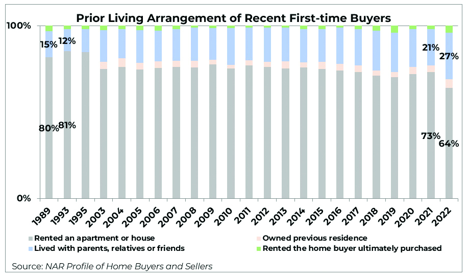 Even among successful first-time buyers, multiple debts made it difficult for them to save for a down payment. Among those who said saving for a down payment was difficult, the most-cited hurdles were high rent (40%), car loan (39%), credit card debt (38%), student loans (35%) and childcare costs (19%). The recent softening in rental prices will be a welcome relief to some moving forward. Twenty-seven percent of successful first-time buyers in 2022 skipped rent and moved directly from a family member’s home into homeownership. This is the highest share recorded by NAR since 1989.