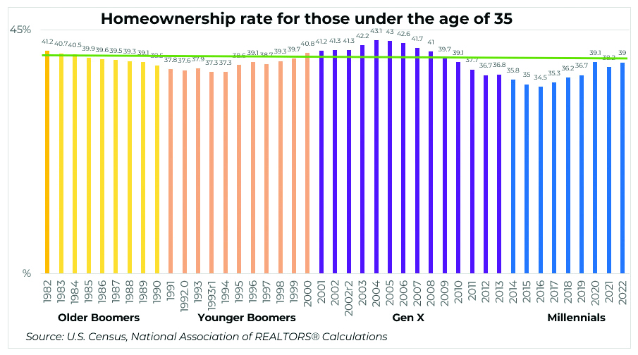 However, if one compares the homeownership rate from 1982 to today, and then separates the data by generation, it tells a less positive story. For baby boomers and Gen Xers, the average homeownership rate for those under 35 was 39.7%. There has yet to be a year that millennials have reached that number.