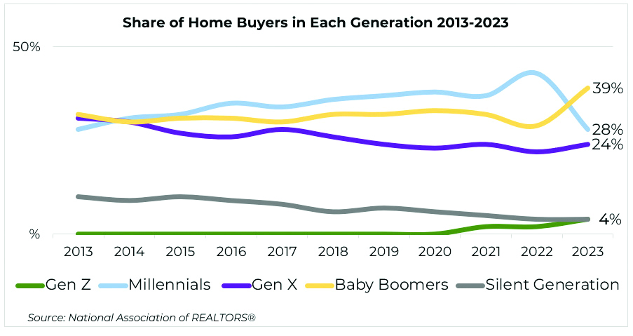 That leads to the last chart (see below). Even though millennials are the largest adult generation in the U.S. today, they represented a shrinking share of the market last year. This is at odds with what one would expect. That’s because most millennials have reached an age where a home purchase, or at least household formation, is typical. Yet, this year’s data shows that baby boomers overtook millennials as a share of the market. One clear reason is that older buyers have saved money and benefited from home-price appreciation, giving them the ability to pay all cash for a home purchase. With 51% of older boomers and 32% of younger boomers paying cash for their most recent purchase, boomers are the likely winner if there is a bidding war on a home.