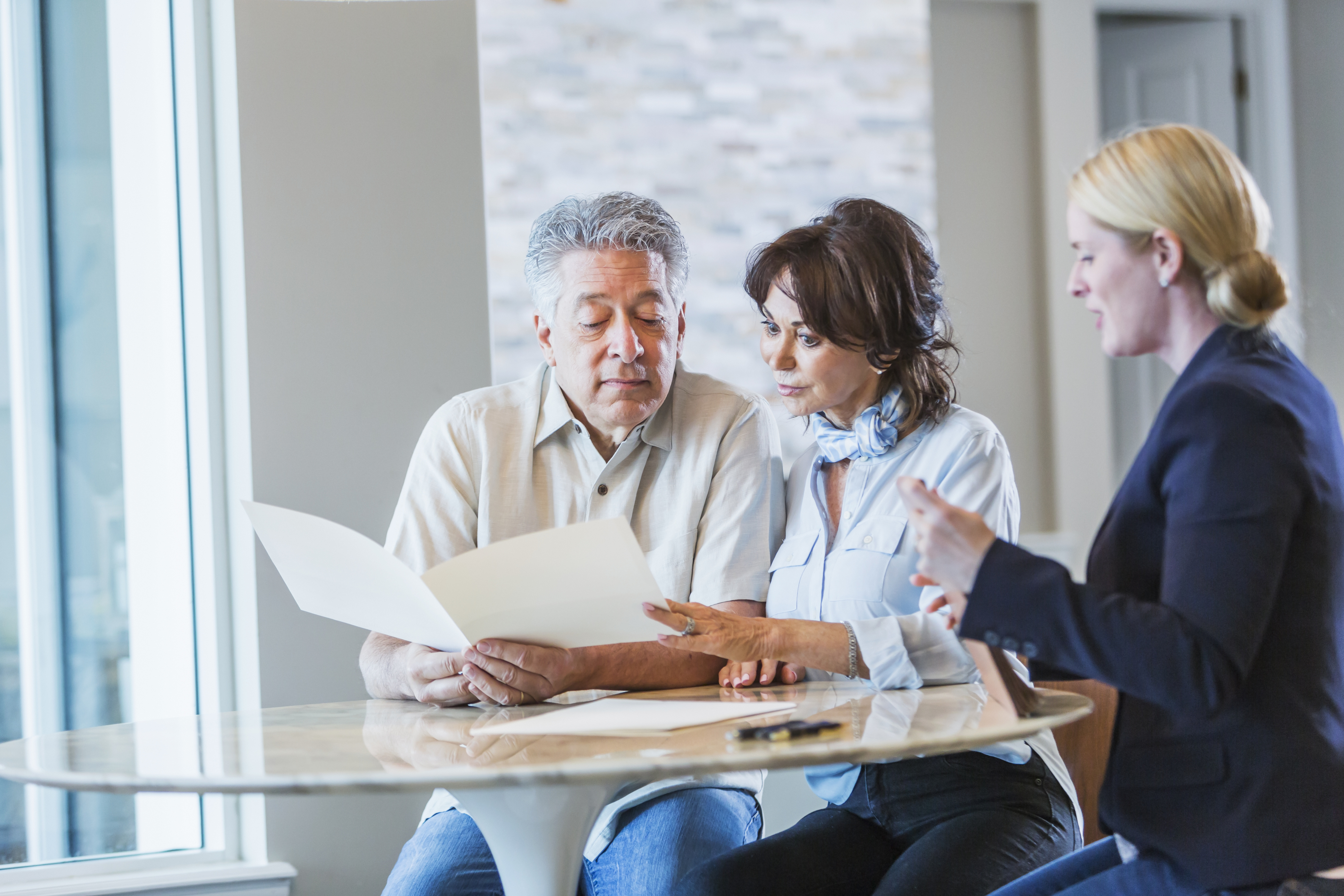 A senior couple sitting down with a personal consultant, perhaps a financial advisor to discuss their retirement plans, or maybe a Real Estate Agent or insurance agent. They are looking at a brochure.