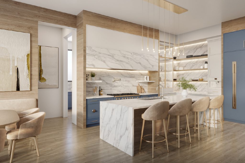The heart of the home lies in the custom-designed kitchen, bar and great room, showcasing hand-selected finishes, such as Aella Marble countertops and backsplash, La Cornue stove, top-of-the-line appliances and tasteful lighting.
