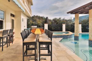 Added Appeal: Luxurious outdoor amenities, including a stone fireplace, heated spa and 22×32-foot pool.
