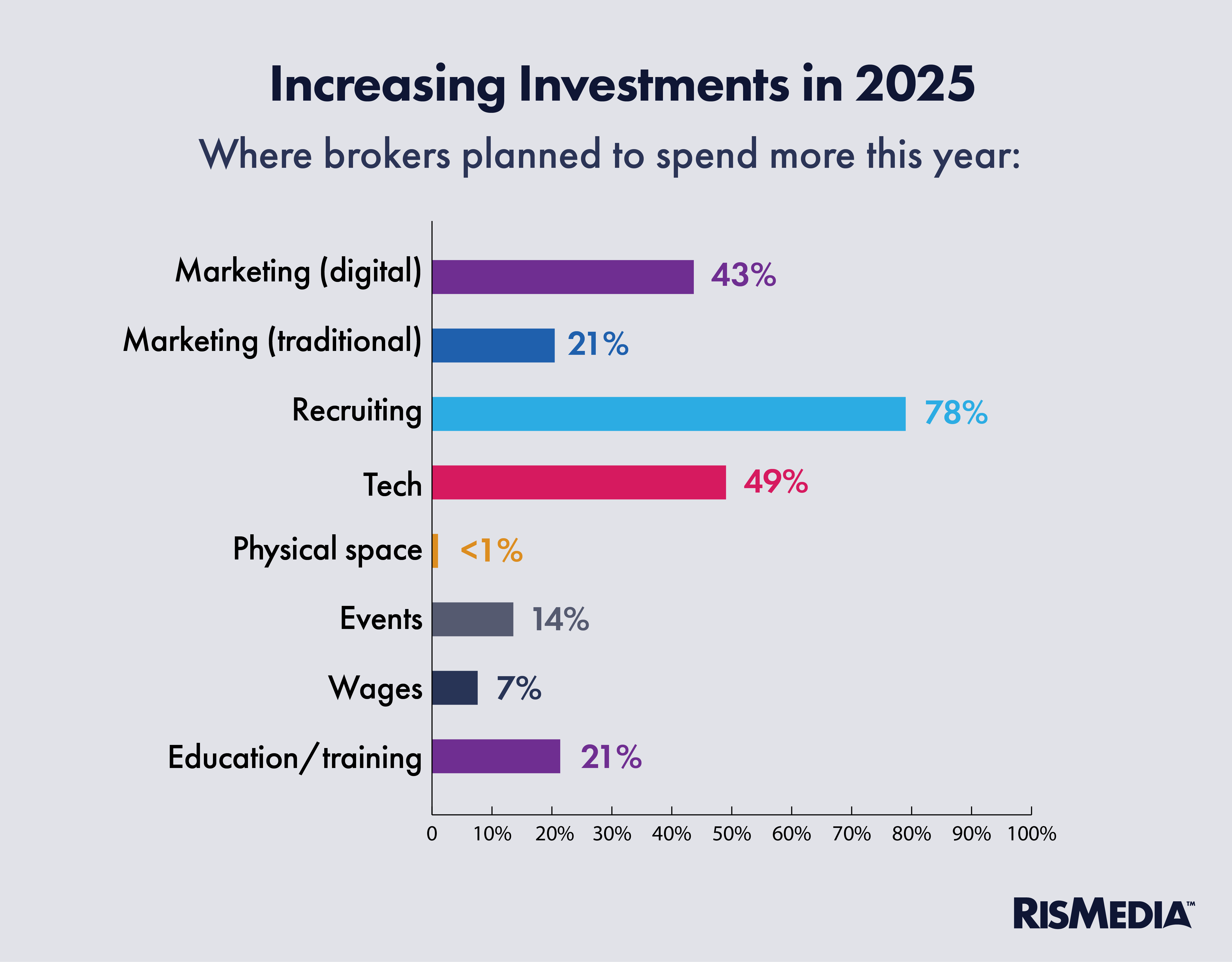 More than half (57%) said they expected to rack up a higher sales volume in 2025 compared to last year, and most said they planned to increase or maintain their investments in marketing, recruiting and technology. A whopping 78% said they would be investing more in recruiting this year.