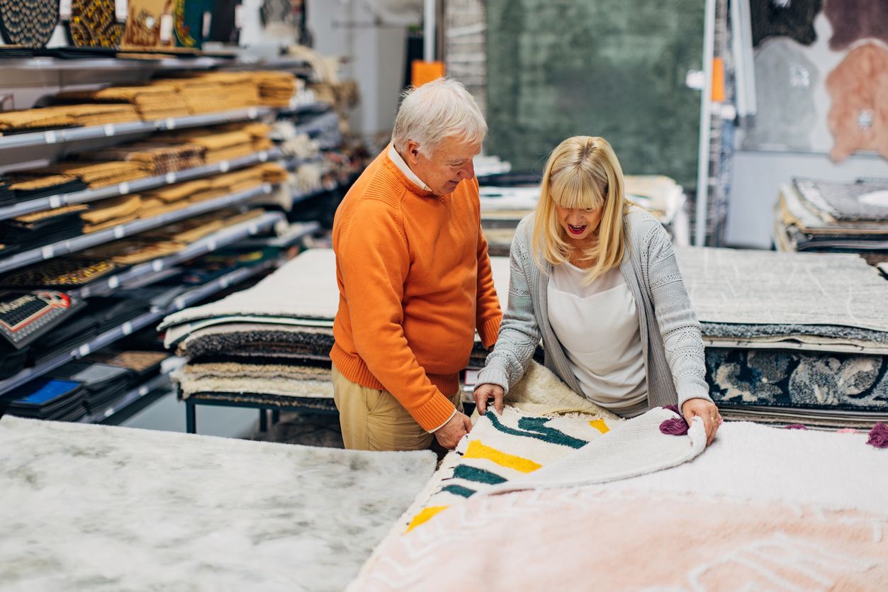 Happy senior couple buying rugs in furniture store. Cheerful elderly husband and wife shopping for household goods together