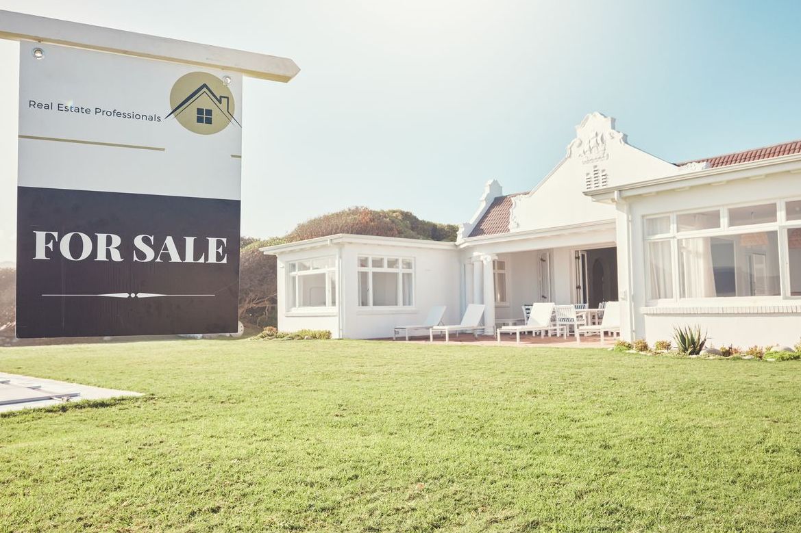 House, property and for sale sign, real estate and advertising with mortgage, investment and selling home. Building, lawn and opportunity with real estate agent service, poster and finance with insurance