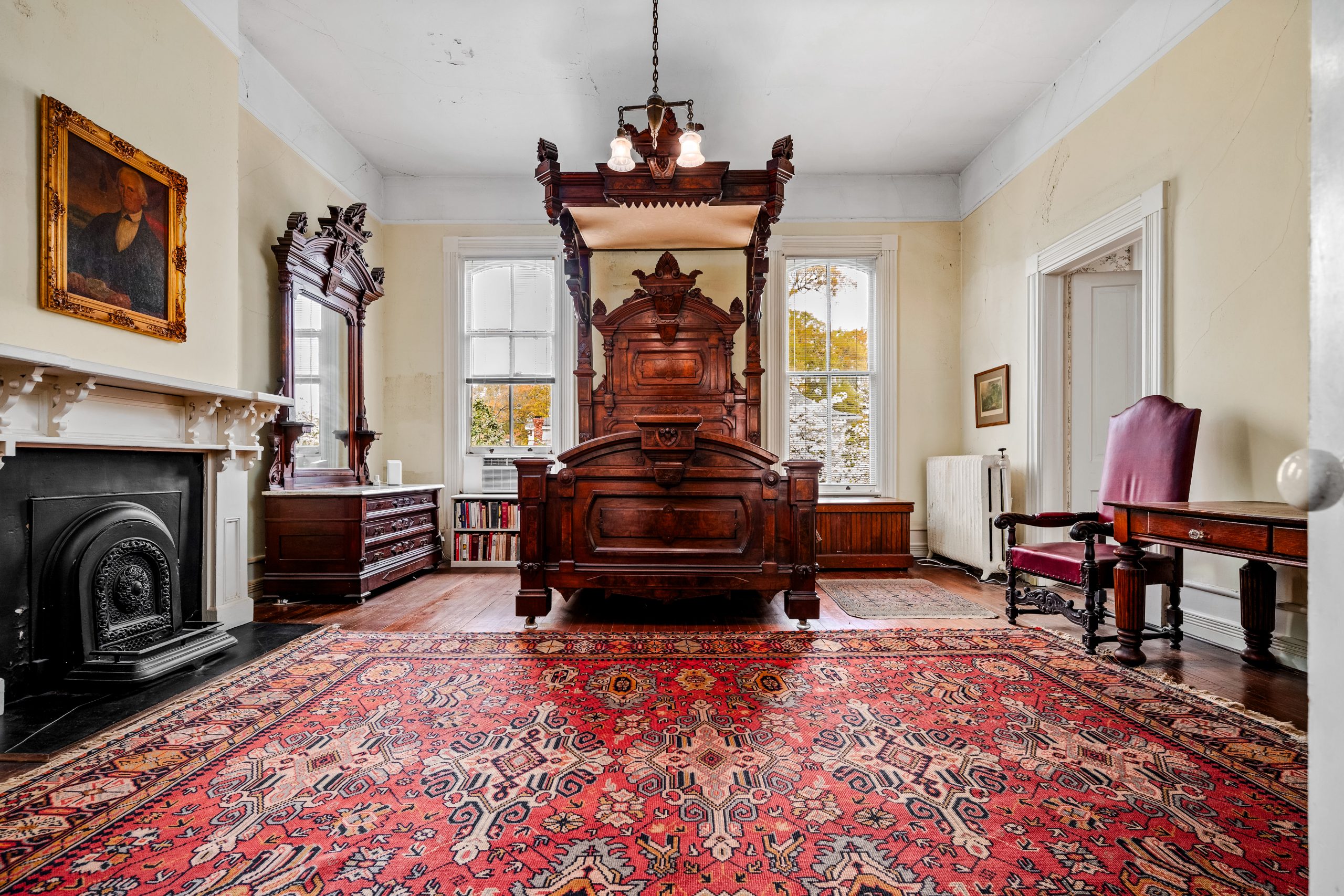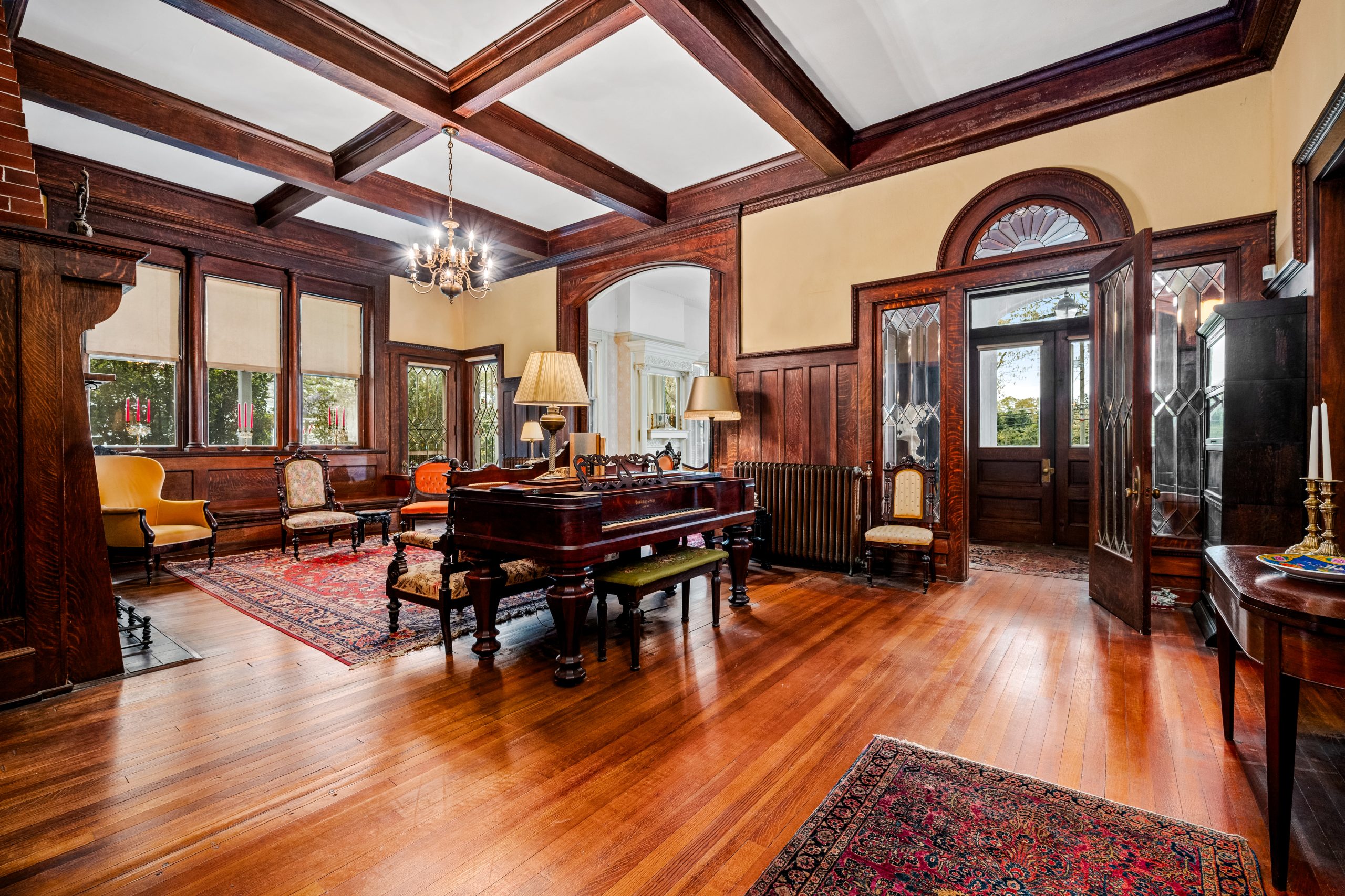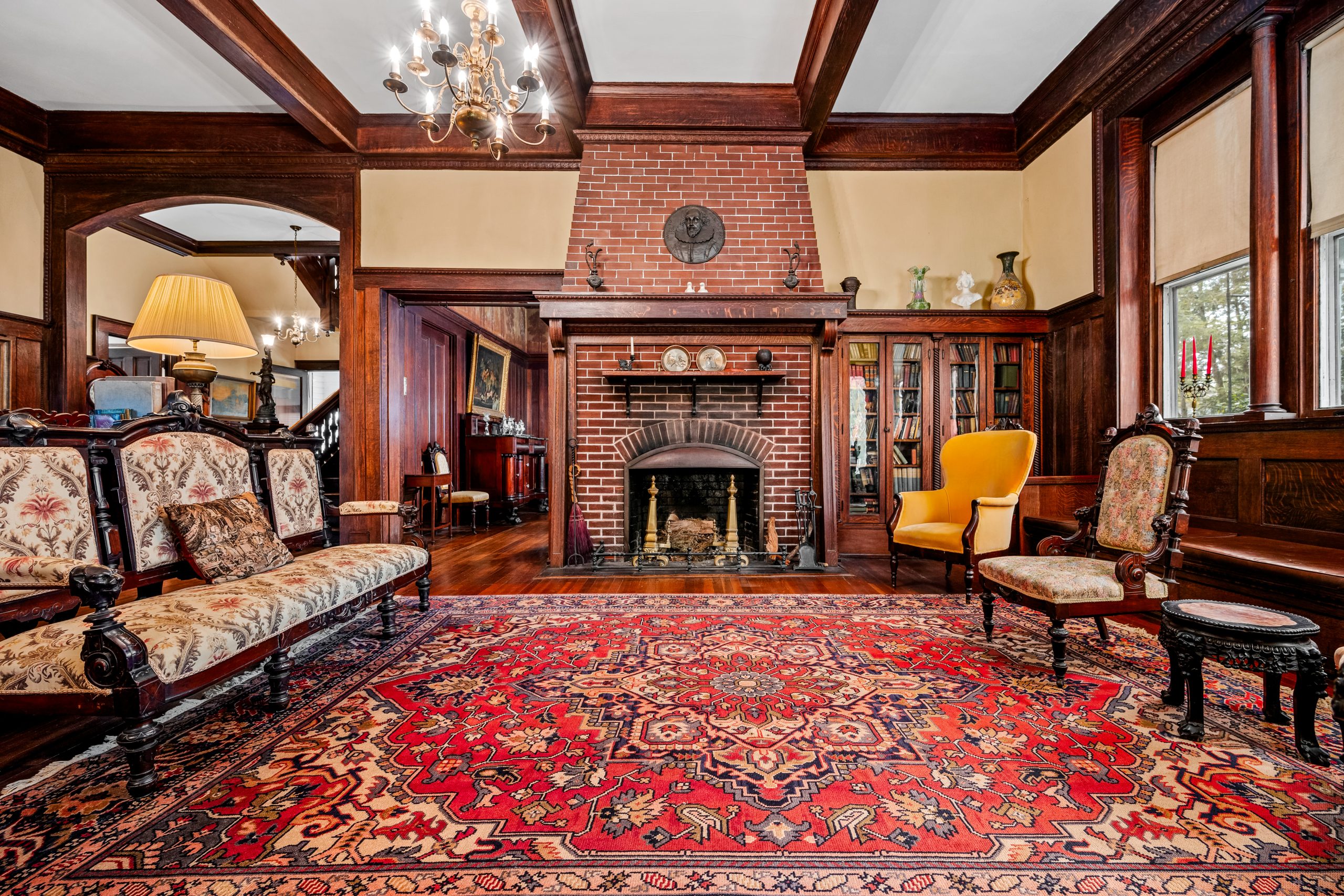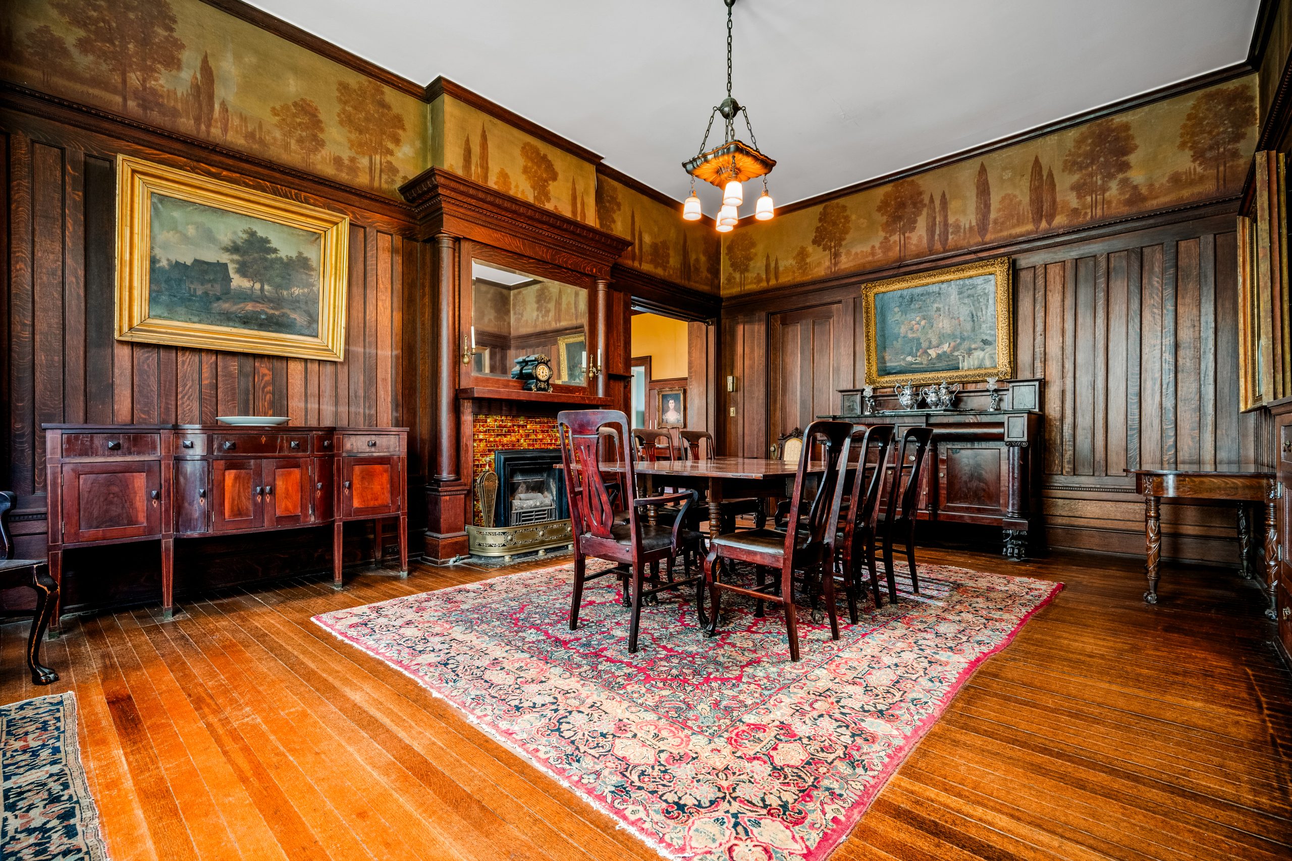Inside, every detail tells a story: light streams through leaded glass doors and tall windows, illuminating quarter-sawn oak paneling, plaster medallions and intricate woodwork. Eight fireplaces, a built-in grandfather clock crafted from Civil War artifacts and a dramatic walnut staircase all speak to the craftsmanship of another era—while thoughtful updates balance authenticity with comfort.