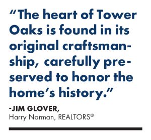 Jim Glover: Tower Oaks is a home that immediately draws you in. Its sweeping front porch, dramatic rooflines and tall windows create a striking first impression, while every detail inside feels intentional and full of character. The layout blends grand entertaining spaces with intimate rooms, offering both elegance and comfort. From the moment you step inside, the home begins to tell its story.