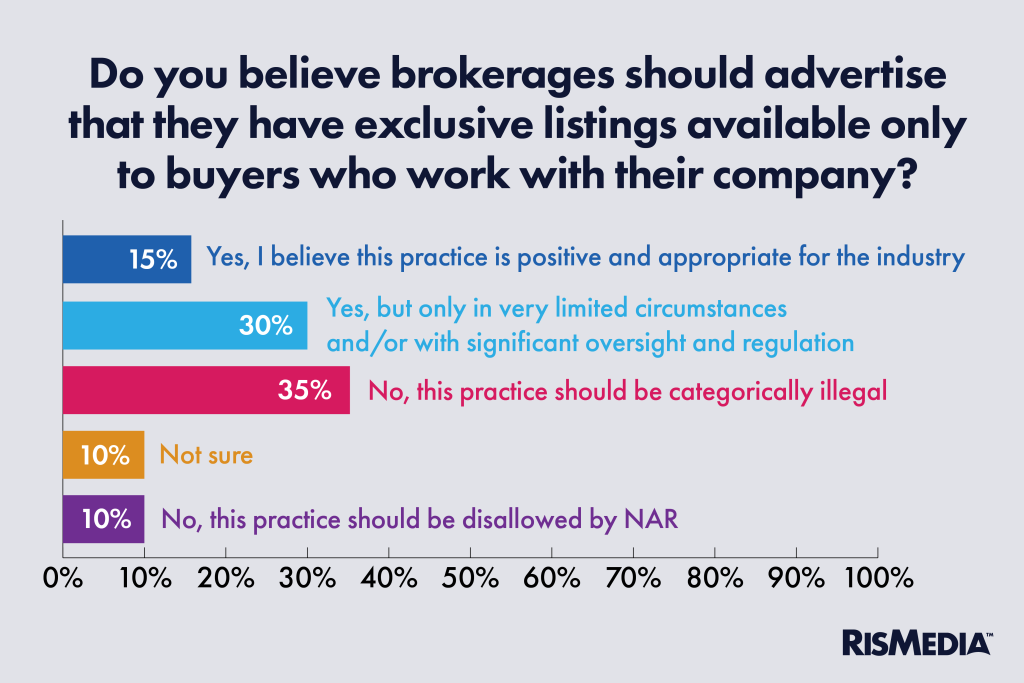 The majority of respondents were clear on the question of whether or not brokers should advertise that they have exclusive listings available only to buyers who work with their company. 35% said this practice should be categorically illegal while 30% said it’s ok only in very limited circumstances and/or with significant oversight and regulation.