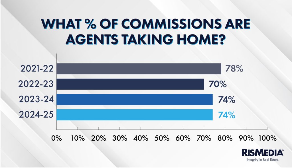 For context, the average commission that agents took home peaked at nearly 80% in the pandemic boom market, but quickly reverted back toward 70% as real estate transactions shrank. There was also little indication in the early days of the settlement that brokerages were rushing to change their fees or splits—but what about a year later?