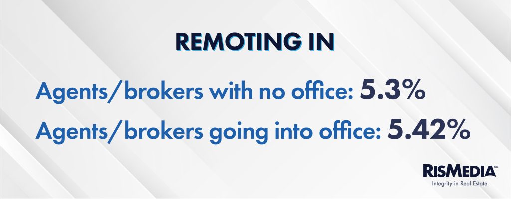 As far as what is best for a real estate professional’s bottom line, the gap in commission rates between all-remote agents and those who had an office to go to also moved back toward recent norms.